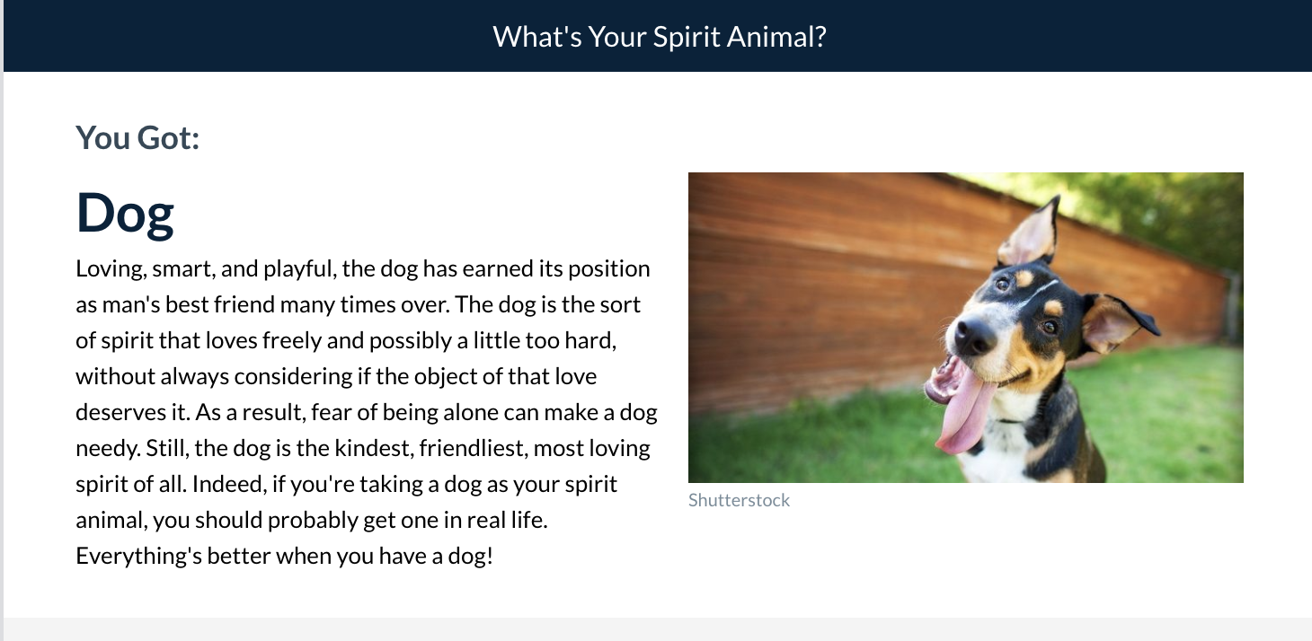 So tonight, as I was fighting writer’s block with a cruise through Facebook, I couldn’t resist when I came across a What’s Your Spirit Animal link. Wading through the pop-ups and static ads, I answered questions about my work style, favorite way to eat, what my house looks like and social habits to come to the conclusion that I’m a…drumroll please...dog.